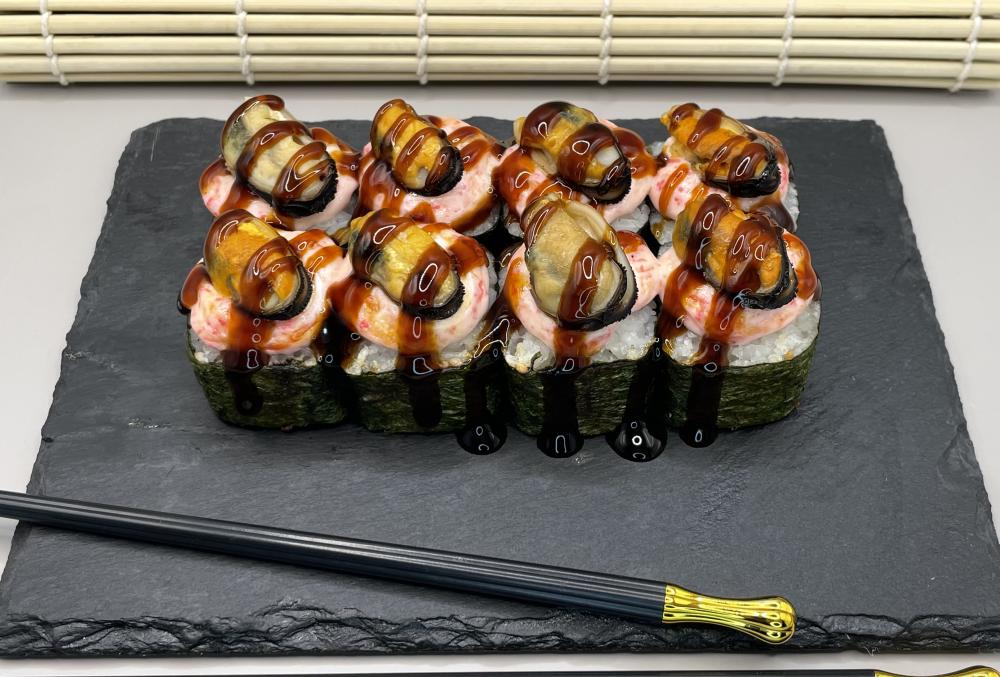 Состав (рис, нори, огурец, игай, яки соус, унаги соус); 1 палочки, 1 соевый соус, 1 имбирь, 1 васаби.