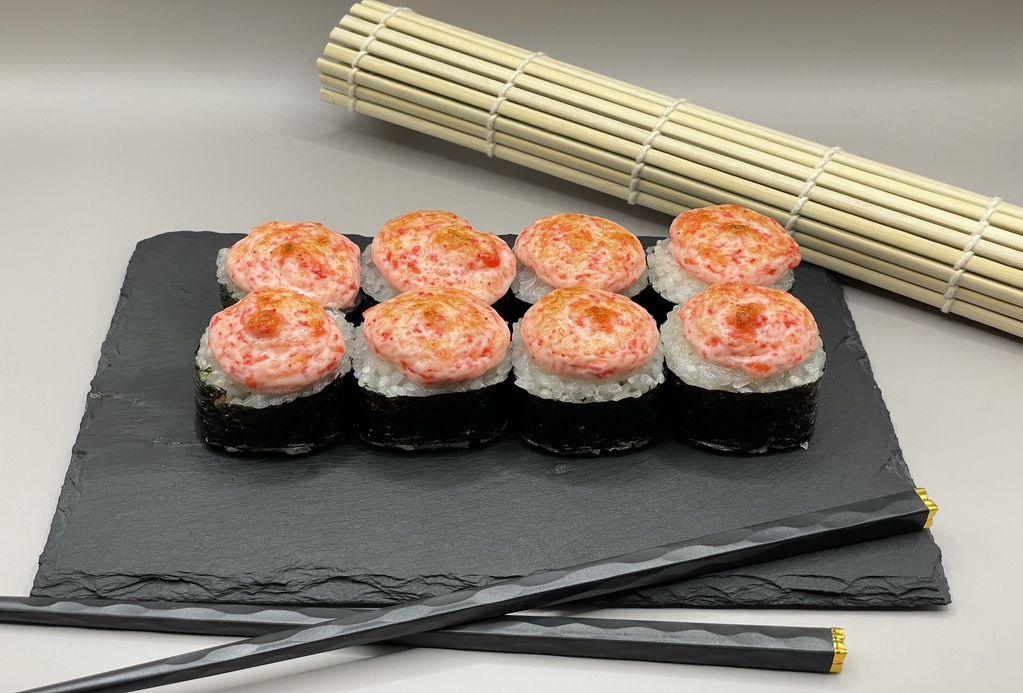 Состав (рис, нори, огурец, авокадо, краб, масаго, сырный соус); 1 палочки, 1 соевый соус, 1 имбирь, 1 васаби.