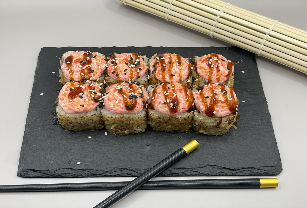 Состав (рис, нори, сыр сливочный, лосось, огурец, угорь, масаго, унаги соус); 1 палочки, 1 соевый соус, 1 имбирь, 1 васаби.