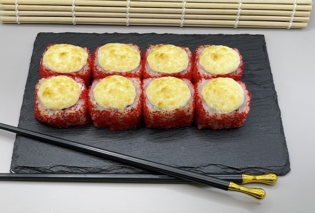 Состав (рис, нори, сыр сливочный, огурец, креветка, масаго, сырный соус); 1 палочки, 1 соевый соус, 1 имбирь, 1 васаби.