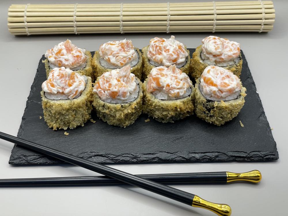 Состав (Рис, нори, сыр сливочный, кляр, сухари панировочные, шапка тар-тар из лосося); 1 палочки, 1 соевый соус, 1 имбирь, 1 васаби.
