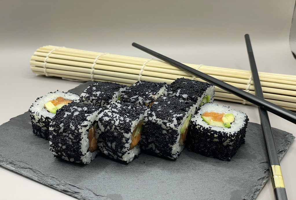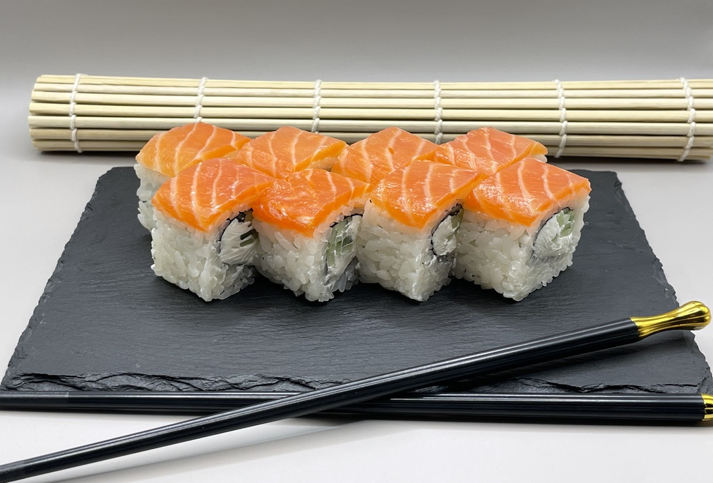 Состав (рис, нори, авокадо, огурец, лосось, масаго); 1 палочки, 1 соевый соус, 1 имбирь, 1 васаби.