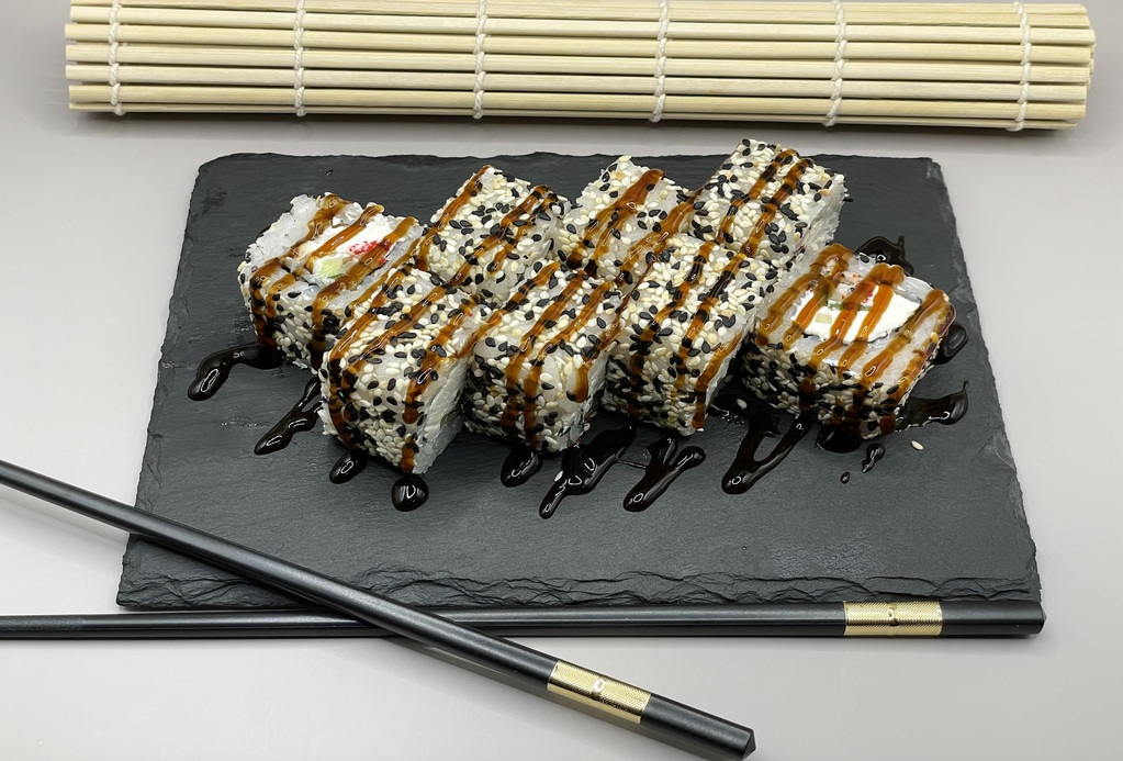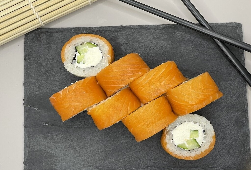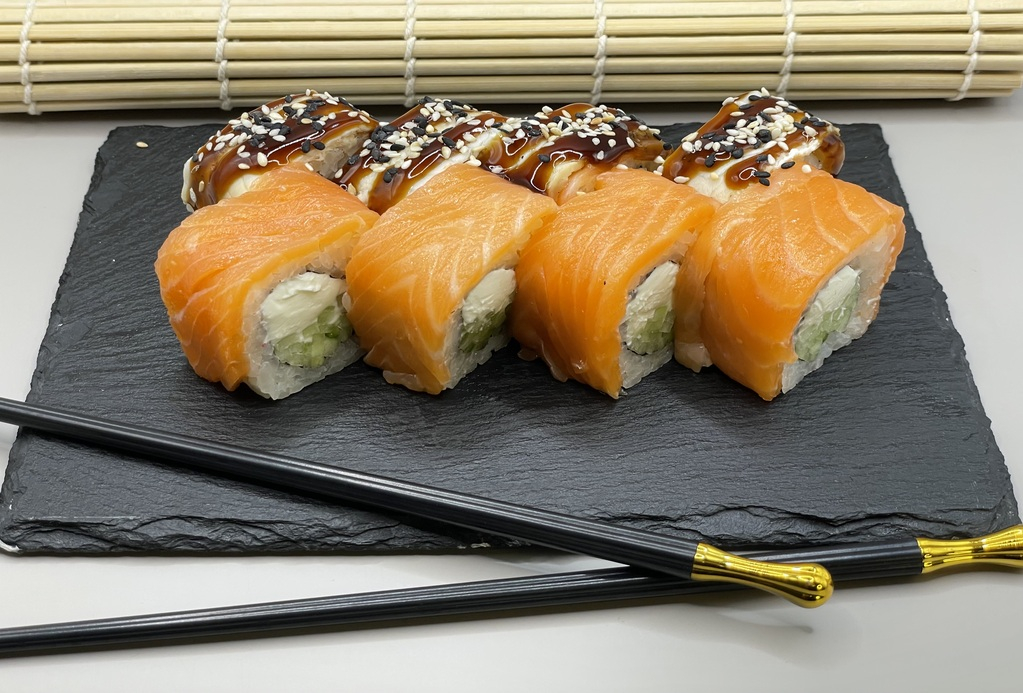 Состав (рис, нори, сыр сливочный, лосось, огурец, угорь, масаго, унаги соус); 1 палочки, 1 соевый соус, 1 имбирь, 1 васаби.
