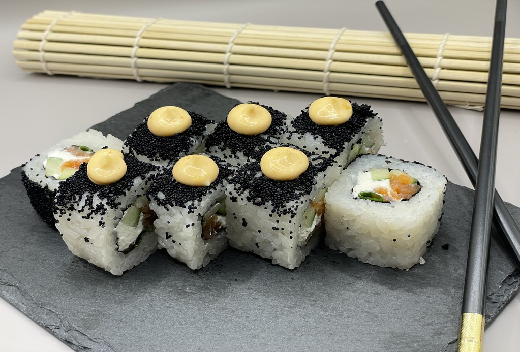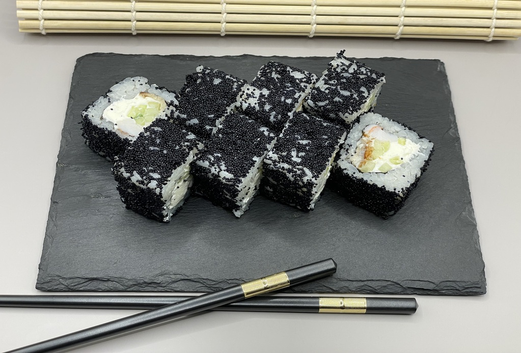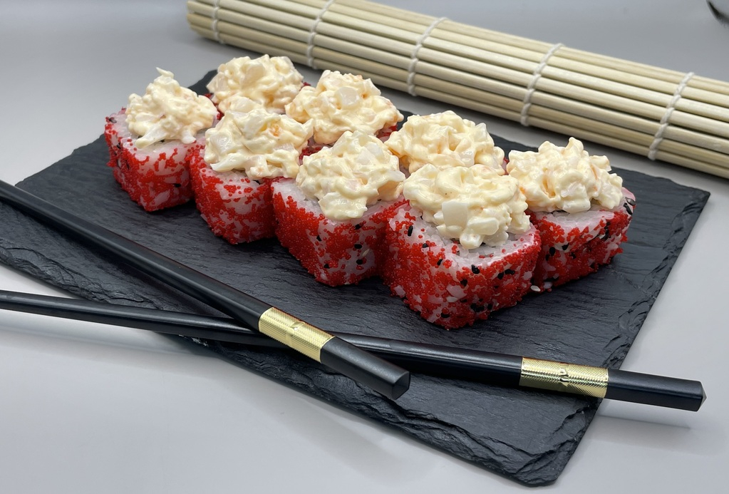 Состав (рис, нори, сыр сливочный, кунжут, масаго,шапка тар-тар из тигровой креветки и кальмара); 1 палочки, 1 соевый соус, 1 имбирь, 1 васаби.