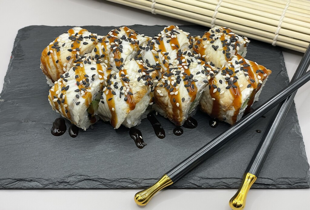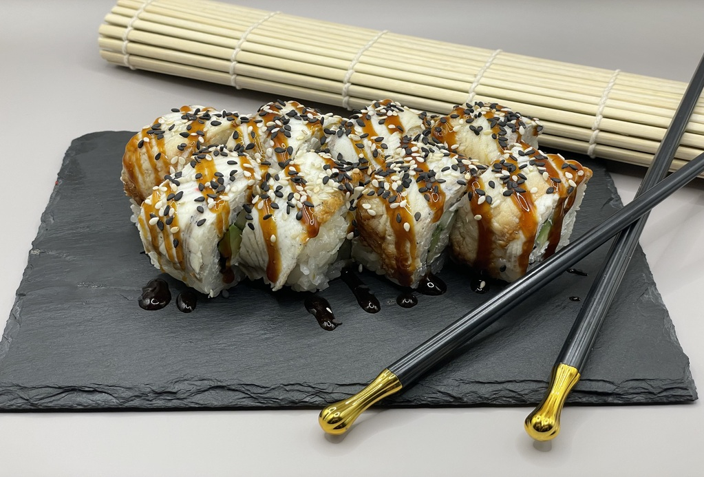 Состав (рис, нори, сыр сливочный, огурец, авокадо, угорь, унаги соус, кунжут); 1 палочки, 1 соевый соус, 1 имбирь, 1 васаби.