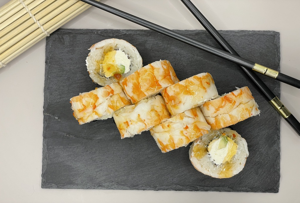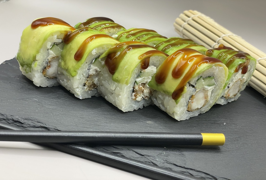 Состав (рис, нори, сыр сливочный, креветка темпура, огурец, авокадо, унаги); 1 палочки, 1 соевый соус, 1 имбирь, 1 васаби.