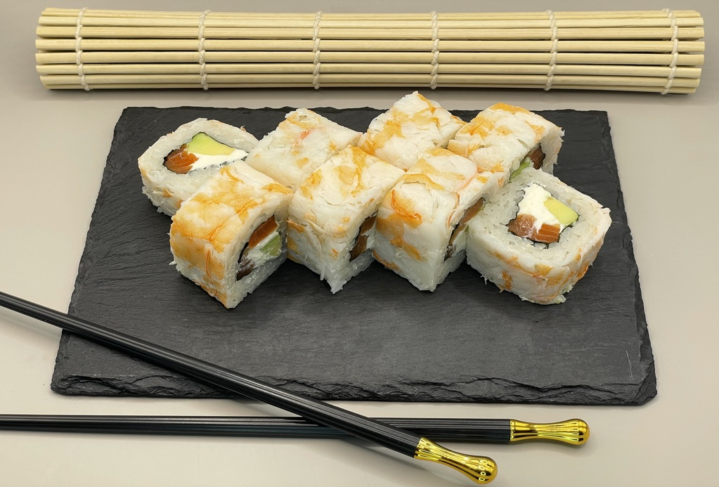 Состав (рис, нори, сыр сливочный, креветка, лосось, авокадо); 1 палочки, 1 соевый соус, 1 имбирь, 1 васаби.