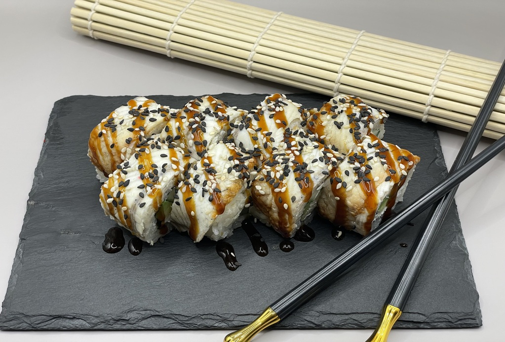 Состав (рис, нори, сыр сливочный, авокадо, спайси соус, угорь, унаги соус, кунжут); 1 палочки, 1 соевый соус, 1 имбирь, 1 васаби.