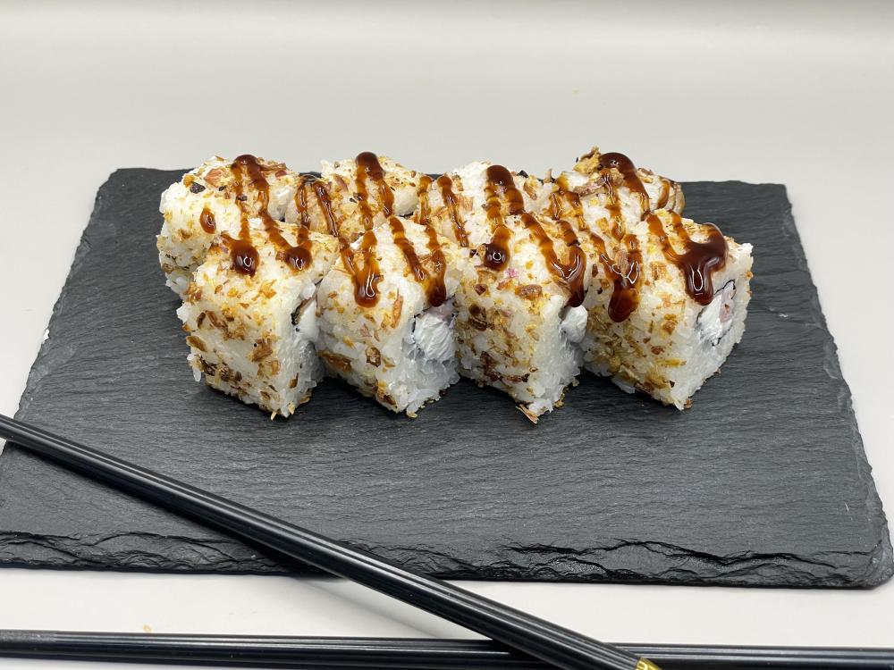 Состав(рис, нори, сыр сливочный, бекон, лук фри, унаги соус); 1 палочки, 1 соевый соус, 1 имбирь, 1 васаби.